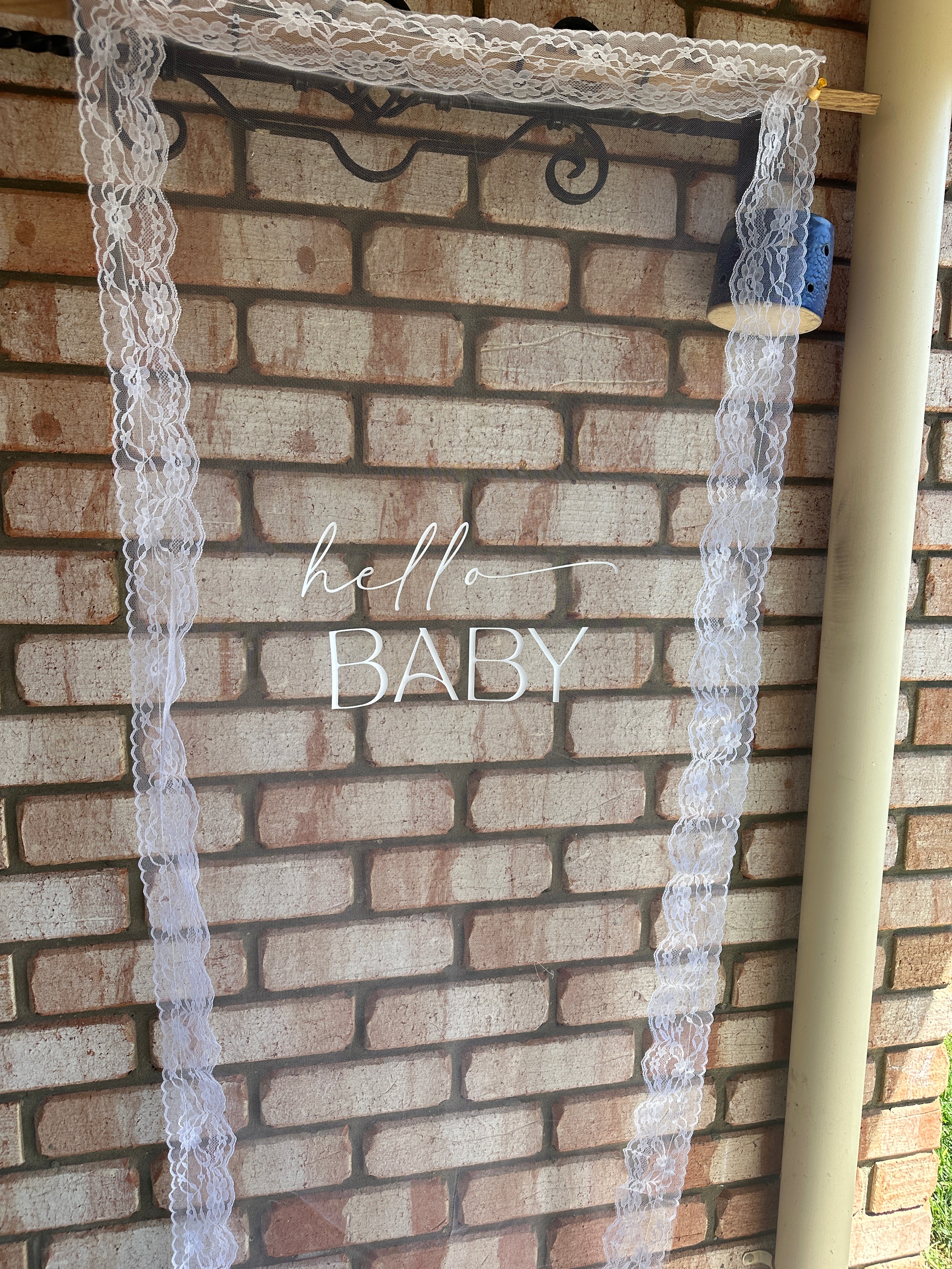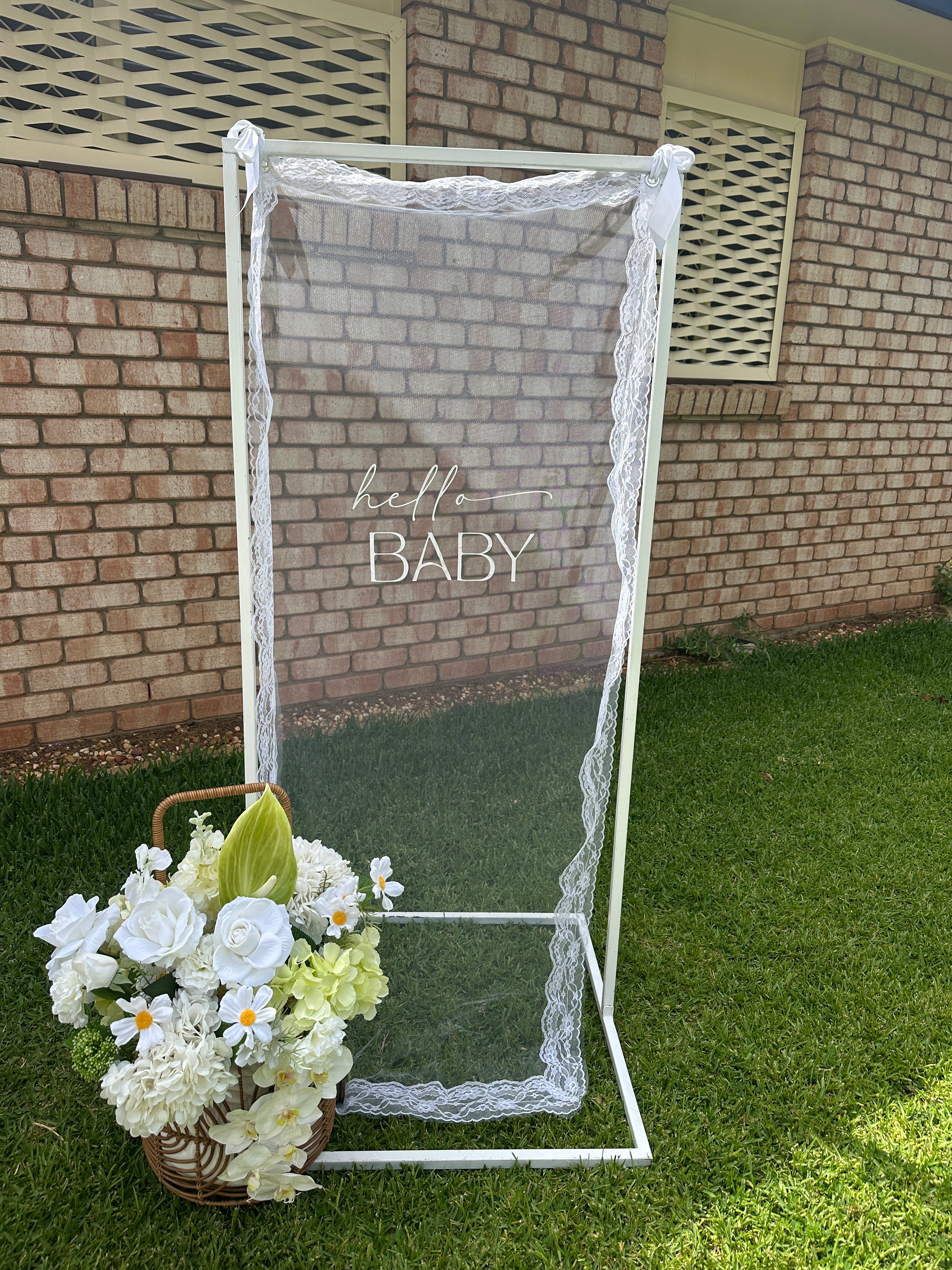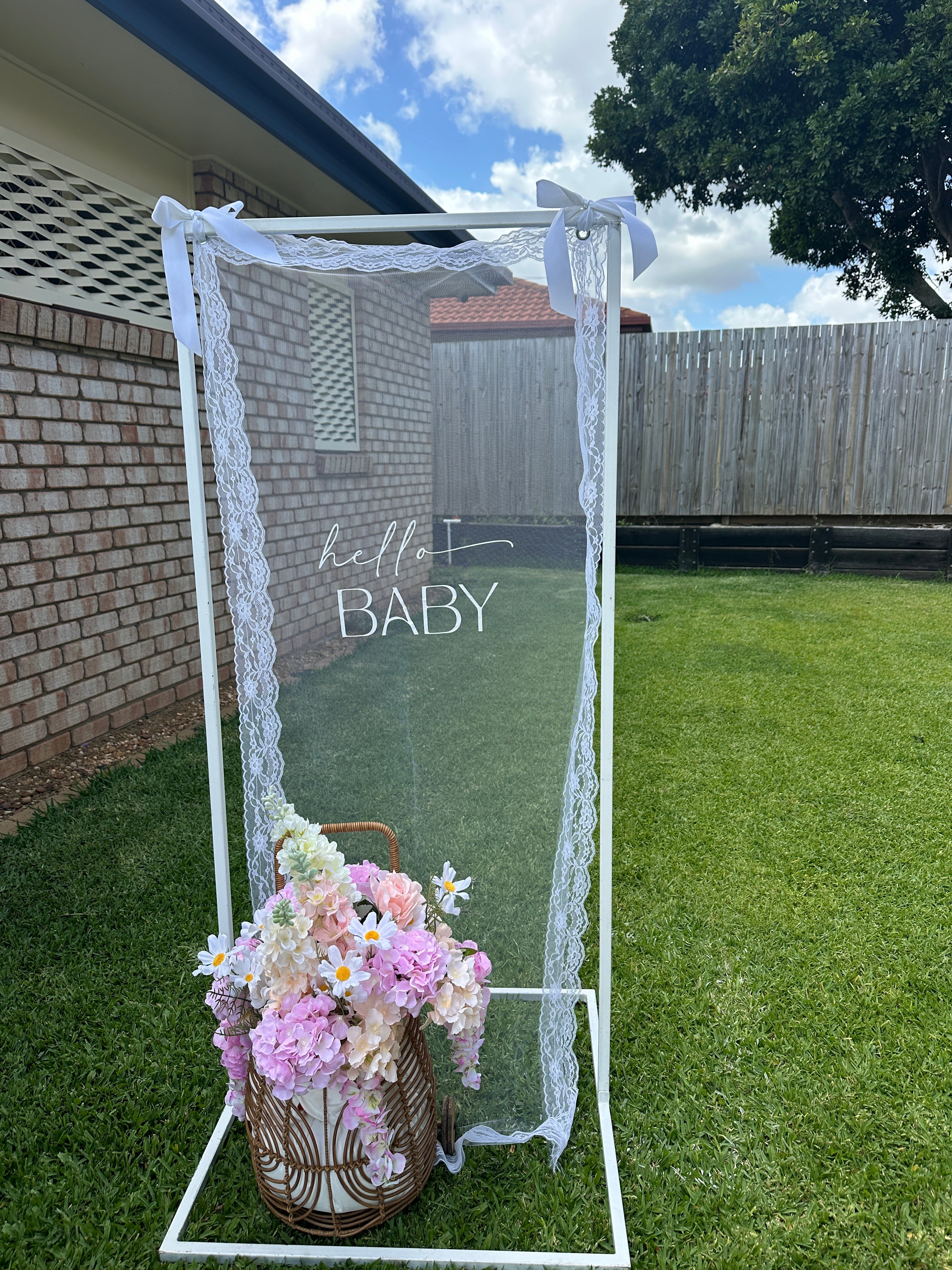 Hire this ‘hello BABY’ white tulle with white lace boarder sign. Perfect backdrop for your memorable photos.