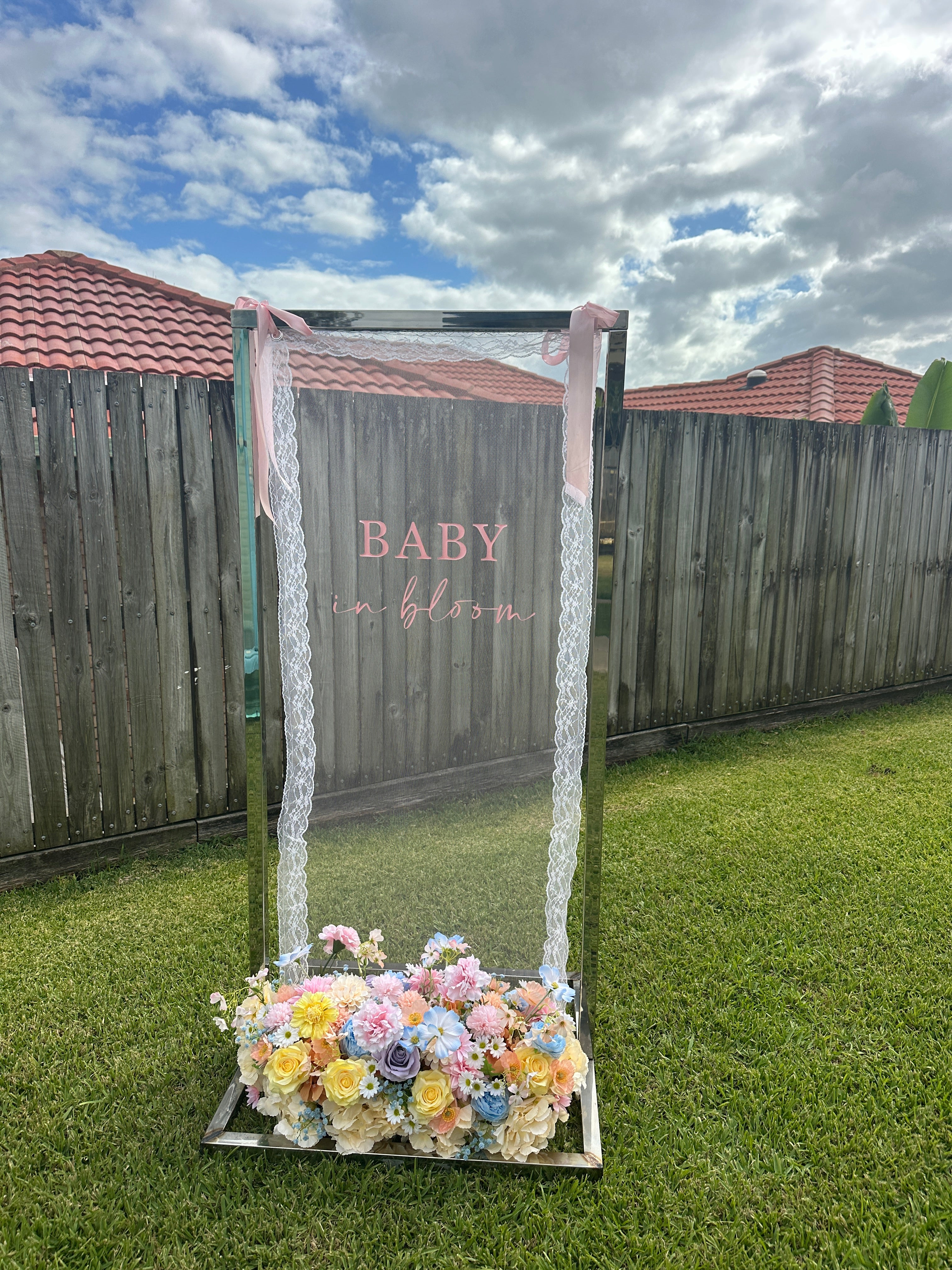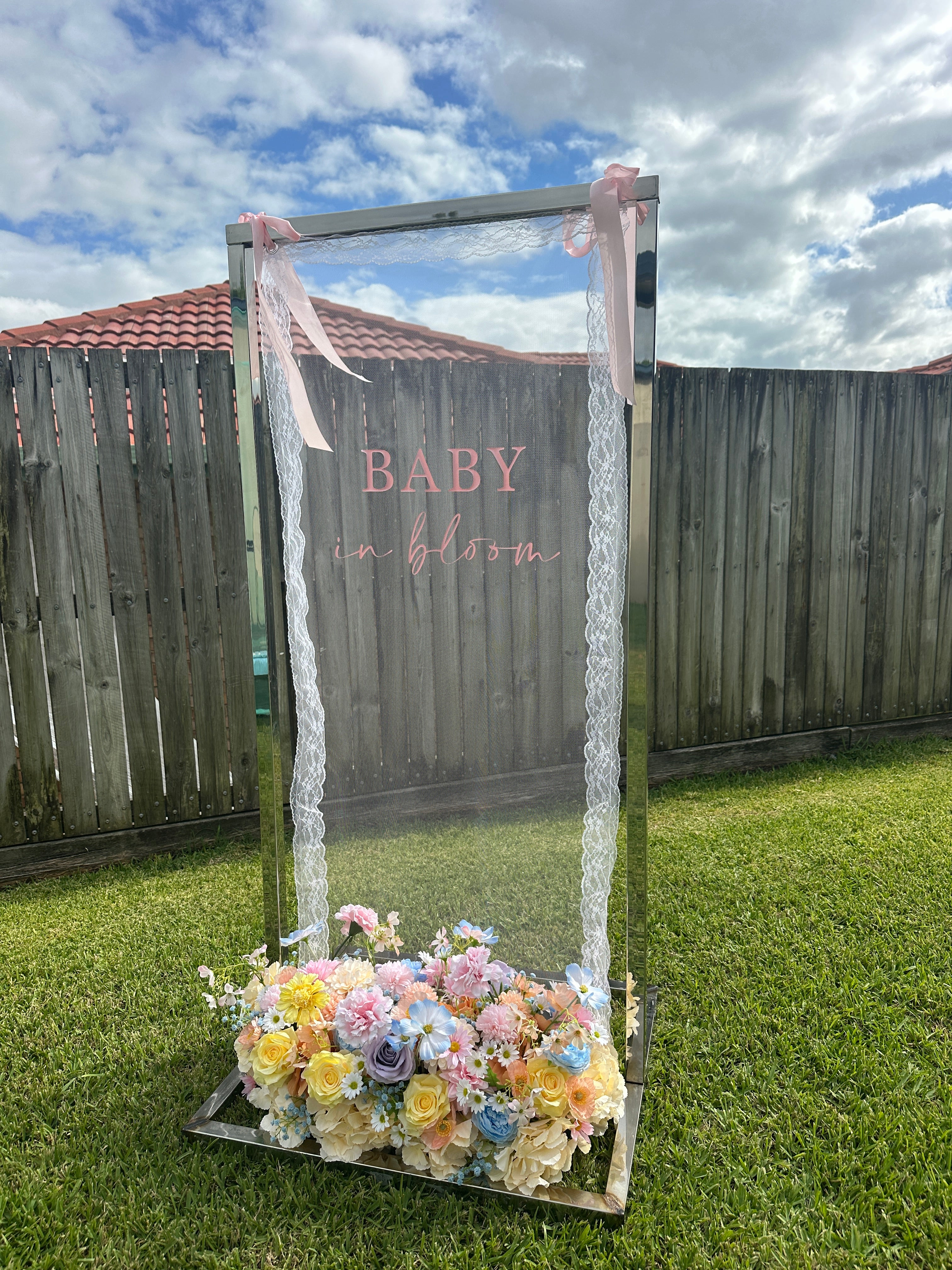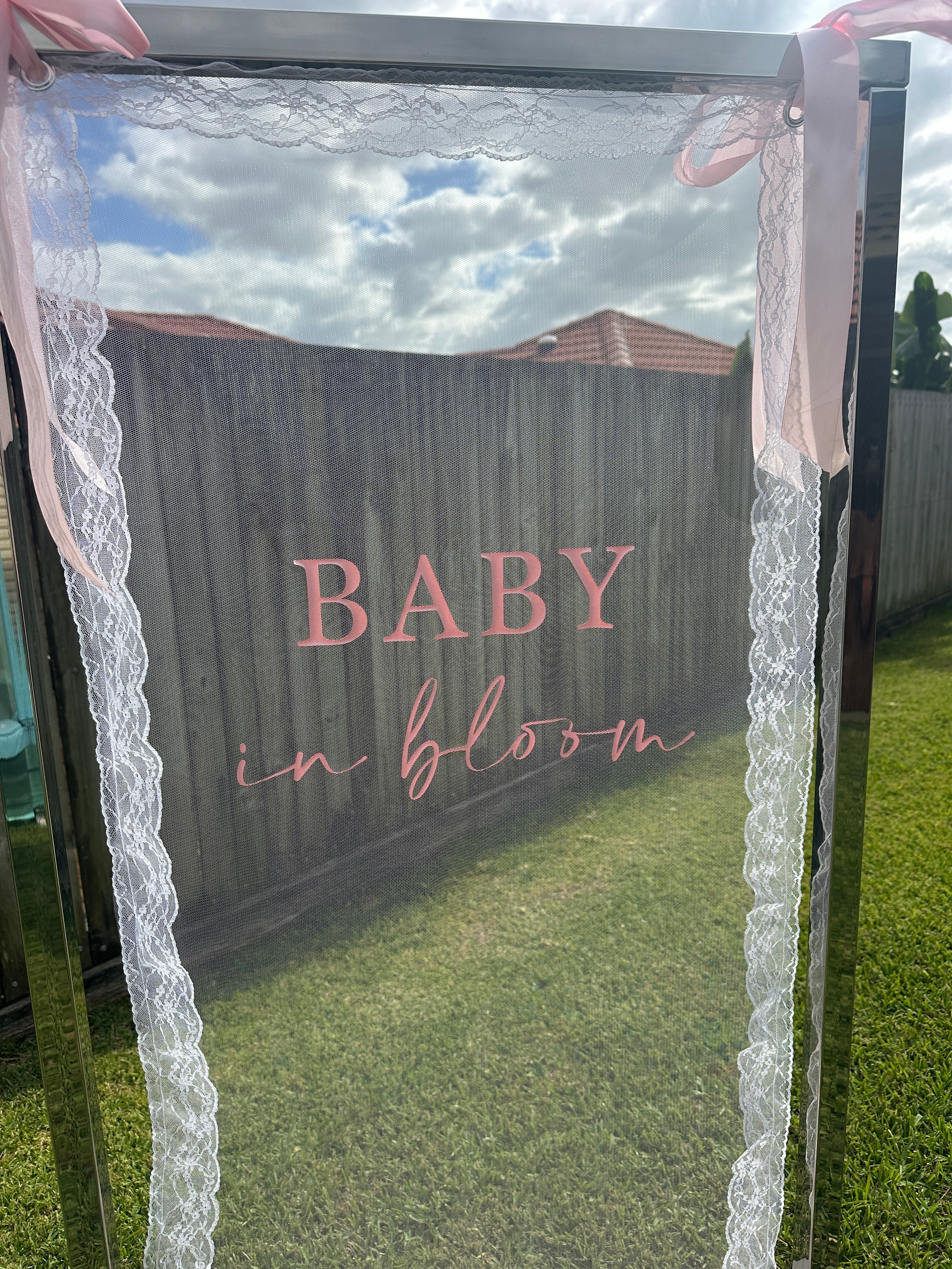 Hire this ‘baby in bloom’ pink tulle with white lace boarder sign. Perfect backdrop for your memorable photos.